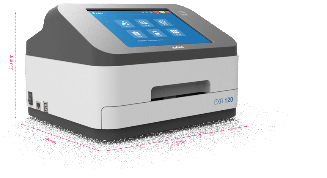O EXR 110 é um analisador POCT quantitativo baseado na tecnologia de fluorescência de imunoensaio, que integra operações, análise e exibição de resultados. Ele realiza automaticamente uma série de operações, incluindo carregamento do cartão de teste, identificação do item, incubação, detecção, descarte do cartão e impressão dos resultados em até 15 minutos. Portanto, o EXR 110 foi projetado para fornecer resultados diagnósticos de forma rápida e fácil.